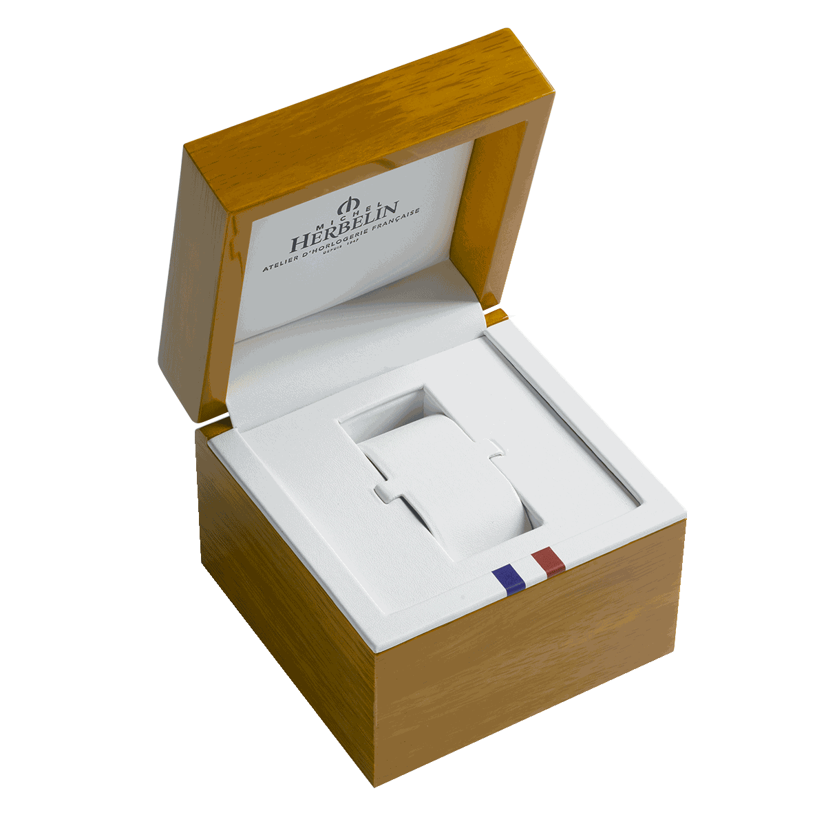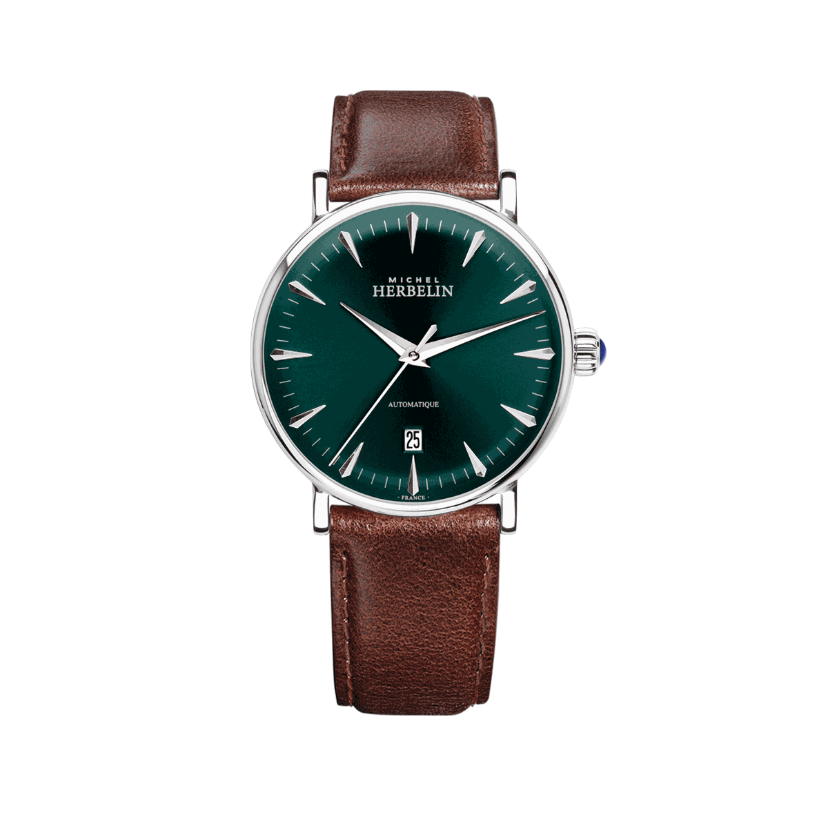 The HERBELIN Inspiration 1947 timepiece draws on the legendary first watches created by Michel Herbelin in the 1950’s. This Inspiration is fitted with a Swiss automatic wound mechanical movement, whose workings can be admired through its transparent caseback. Its softly rounded 40 mm diameter case provides a distinctly vintage feel. The deep green dial decorated with a brushed sunray pattern that reveals multiple nuances in the light. Complemented with a discreet date aperture at 6 o’clock, the ensemble plainly marks the passage of time. This piece is finished with a ribbed, ball-shaped crown set with a blue cabochon, and paired with a shiny brown patina leather. A gem of watchmaking art, it was designed and assembled in France at the Michel Herbelin studios.