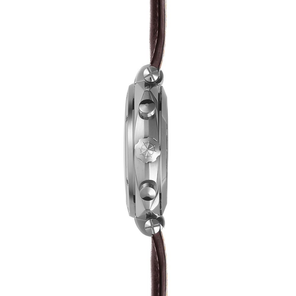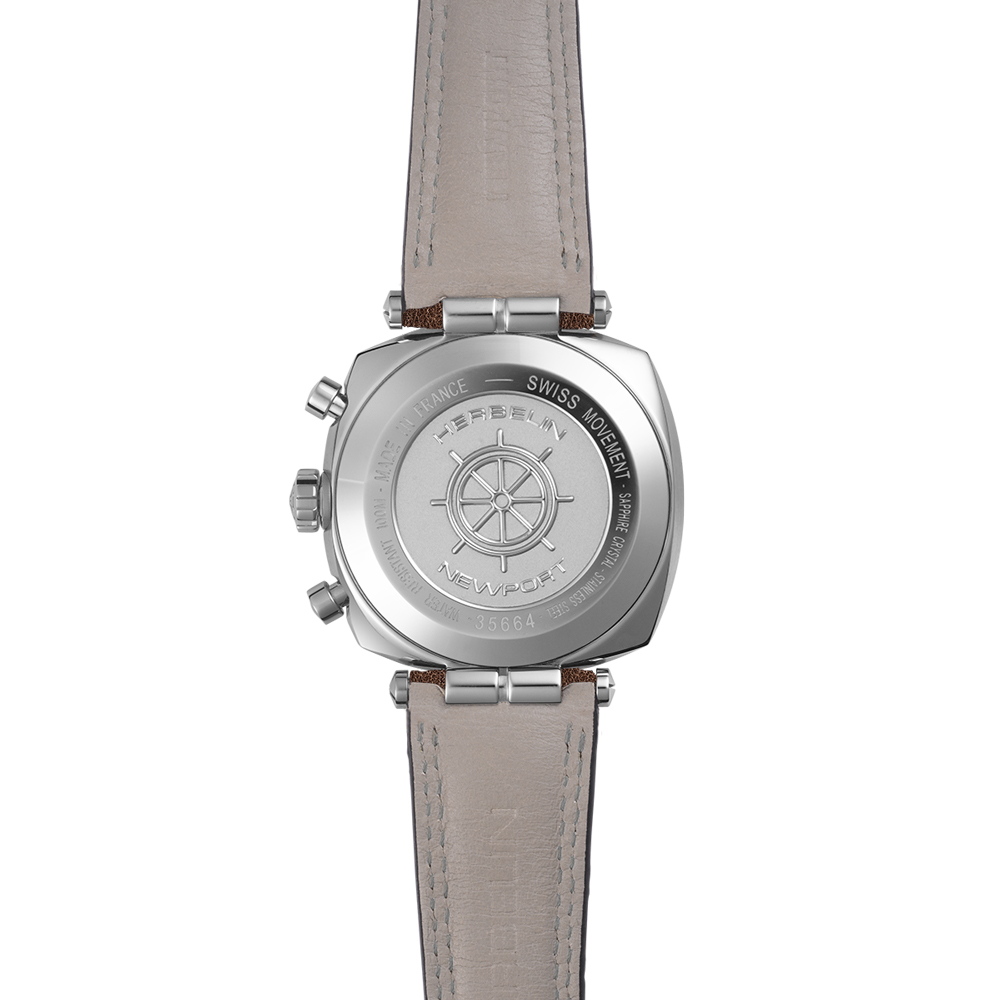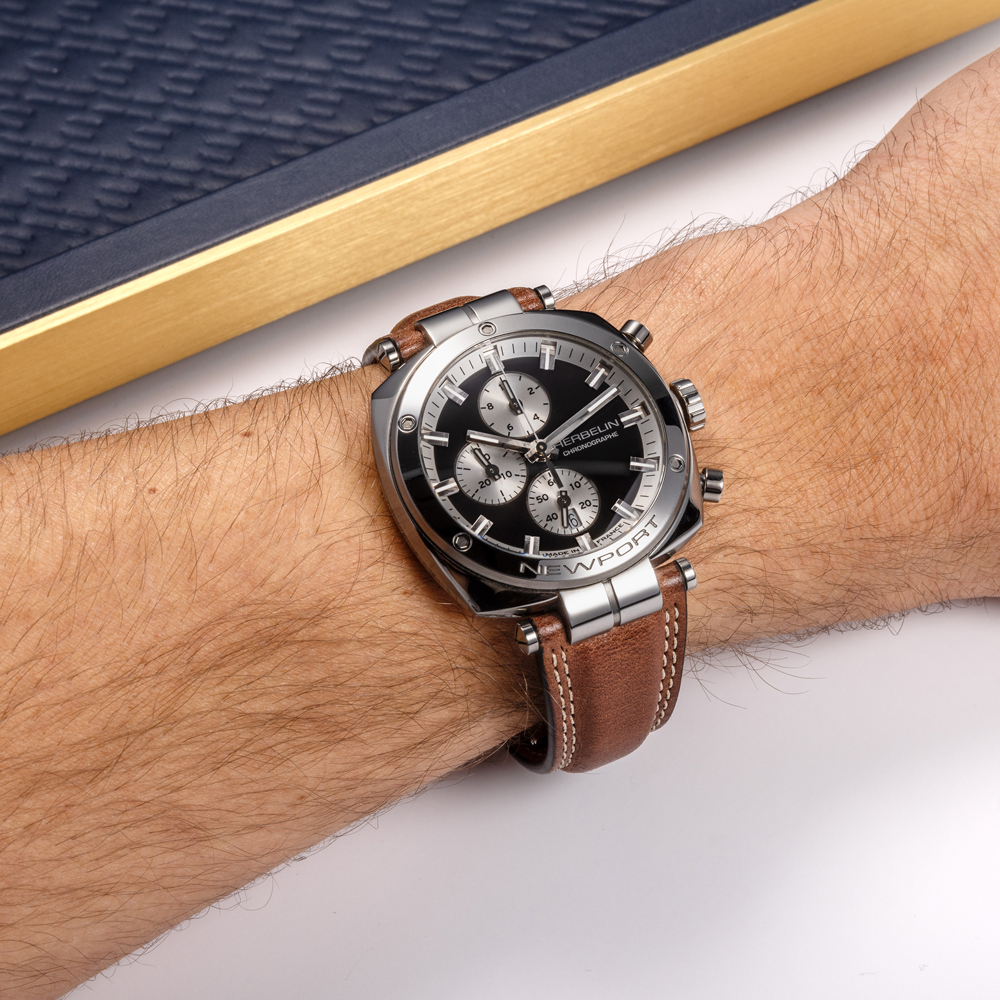 The Newport Héritage Chronograph from HERBELIN remains faithful to the Newport Héritage line. This chronograph adopts the characteristic watchmaking hallmarks of the 1970s, with its 42mm cushion shaped case in-vogue at the time. The Newport black sunray dial features 3 counters positioned in a C shape, protected by a double-sided domed sapphire crystal. This decidedly neo-vintage tri-compax chronograph is nevertheless clearly identifiable as a Newport with its nautical inspiration. The porthole-style bezel with its hexagonal socket-head screws is a strong reminder of this inspiration, as are the central lugs for the bracelet and the presence of an embossed steering wheel on the winding crown. Water-resistant to 100 metres, the Newport Héritage chronograph is paired with a genuine tan leather with double stitching for a modern relaxed feel . A finely-tuned example of French Watchmaking.