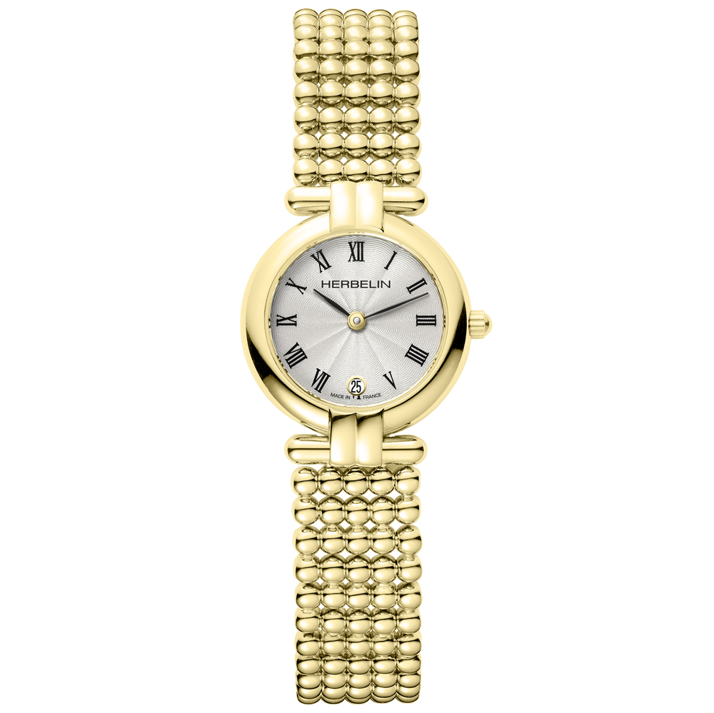 Perles timepiece is a unique design from the French watchmaking brand HERBELIN. The bracelet, which is made up of rows of five beads or perles is so pleasing to the touch and moulds elegantly to the wrist. The dial is in an ivory white turned finish with black roman numerals. Both the case and bracelet are made from 316L grade stainless steel PVD coated in yellow gold. A design that celebrates feminine sophistication, which is the very symbol of French chic.