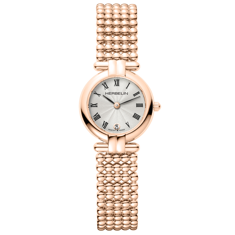 Perles timepiece is a unique design from the French watchmaking brand HERBELIN. The bracelet, which is made up of rows of five beads or perles is so pleasing to the touch and moulds elegantly to the wrist. The dial is in an ivory white turned finish with black roman numerals. Both the case and bracelet are made from 316L grade stainless steel PVD coated in rose gold. A design that celebrates feminine sophistication, which is the very symbol of French chic.
