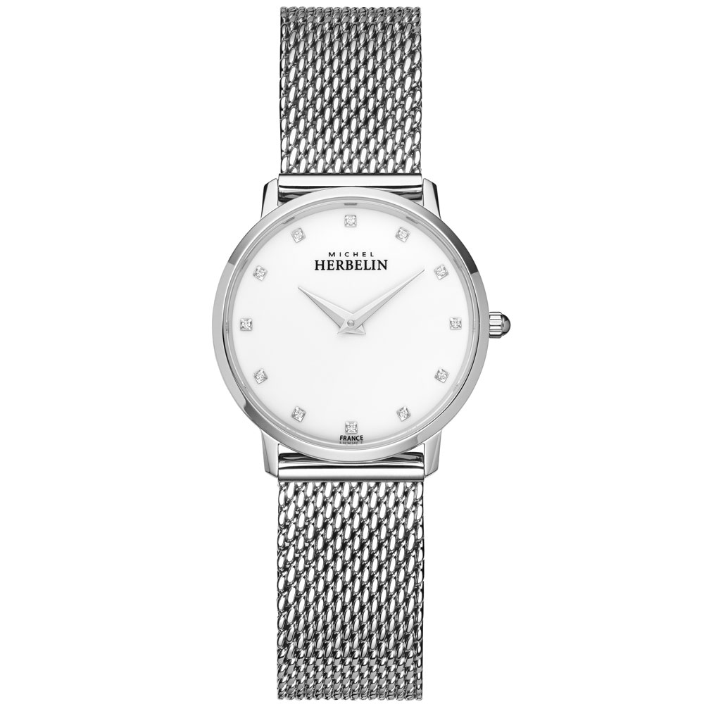 The Michel Herbelin ladies City style is designed for a city setting, casual, practical and yet elegant. The Swiss quartz movement is housed in a sleek 316L stainless steel case, encasing a flat scratch resistant sapphire crystal glass. Featuring white laquer dial with applied spinel hour indices, this timepiece is simple yet elegant. Completed with a practical 316L stainless steel mesh bracelet and a folding clasp. Epitomising true French simplicity – an ambassador of Michel Herbelin mantra.