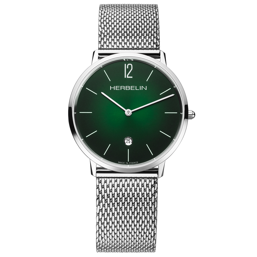 The Michel Herbelin mesh City is designed for a city setting, casual and elegant. The Swiss quartz movement which is housed in a sleek 316L stainless steel case measuring 38.7mm, encasing a flat scratch resistant sapphire crystal glass, and featuring a sunray green dial with applied silver hour indices is a practical yet stylish accessory . This piece is completed with a 316L stainless steel mesh bracelet and a folding clasp. . Trendy yet sophisticated, this timepiece is designed for the modern day metropolitan individual in any city setting they may find themselves in.Epitomising true French elegance.an ambassador of Michel Herbelin mantra