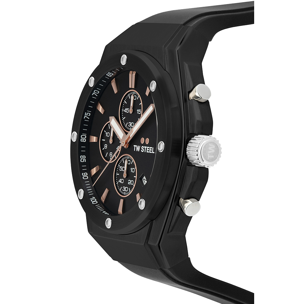 | Dial | Black satin chronograph dial with rose gold indicies and date |